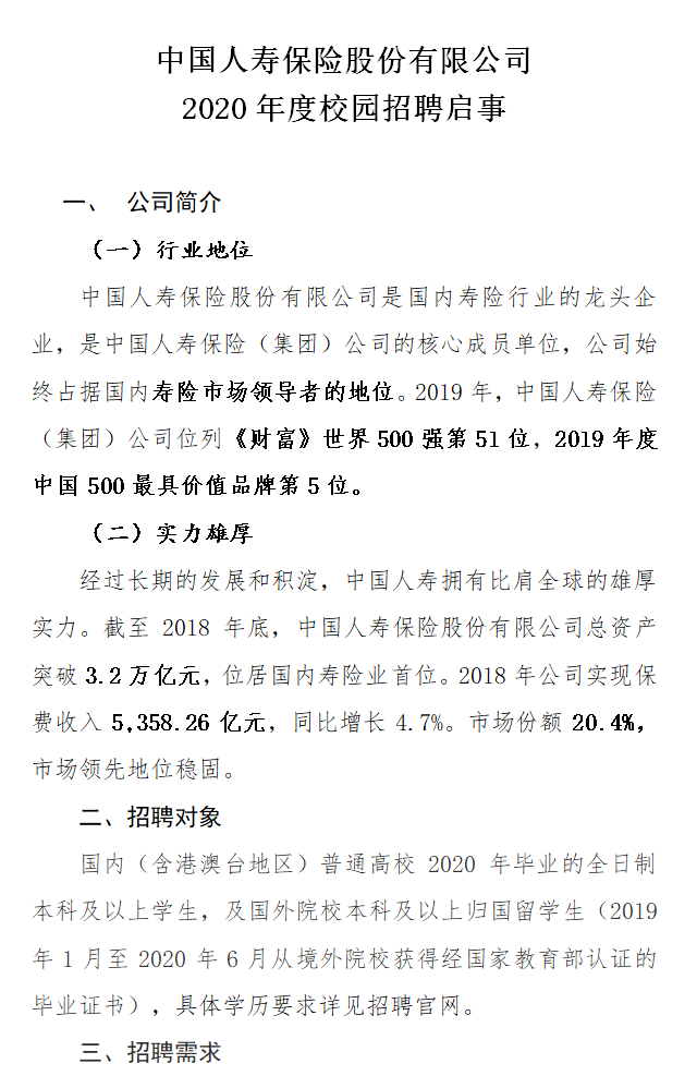中国人寿保险股份有限公司 2020年度校园招聘启事